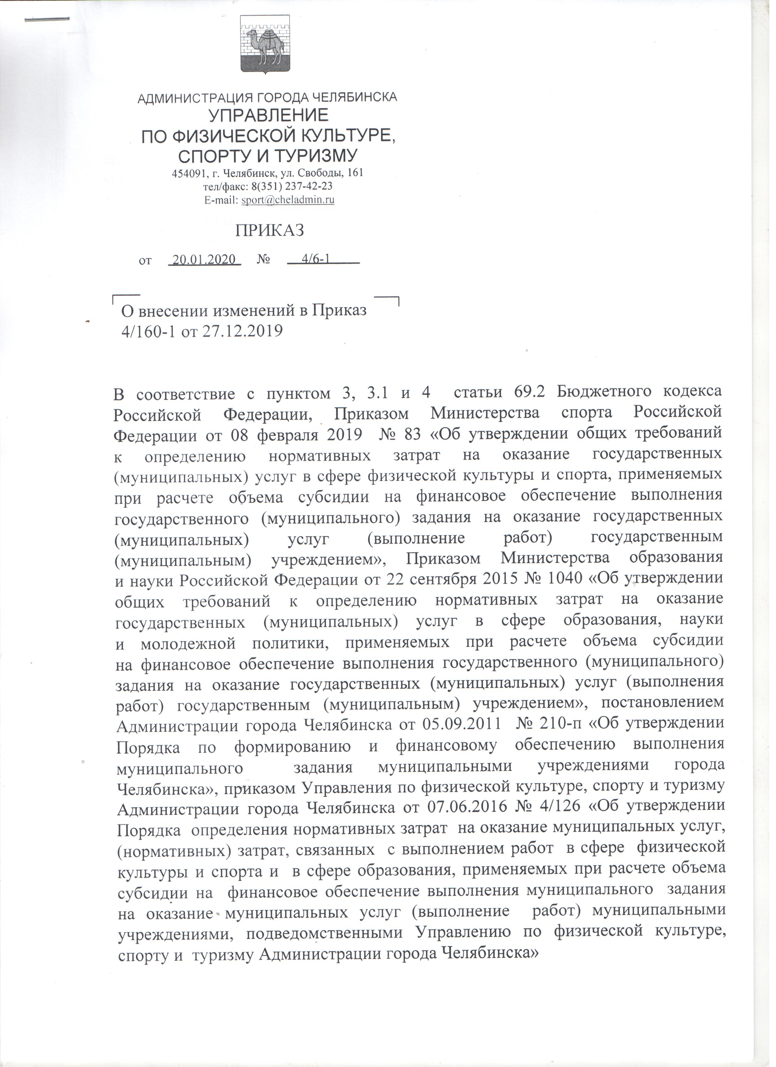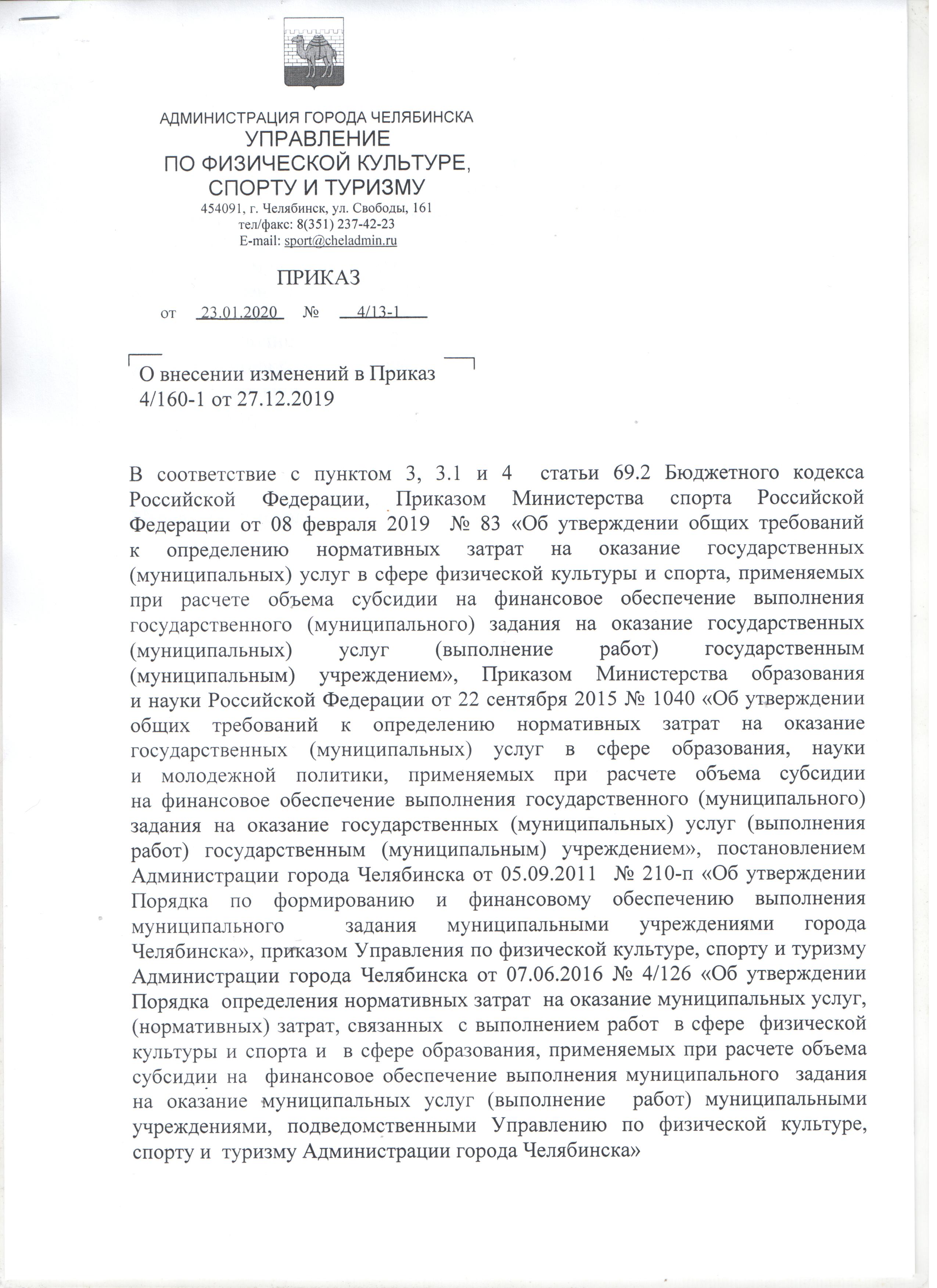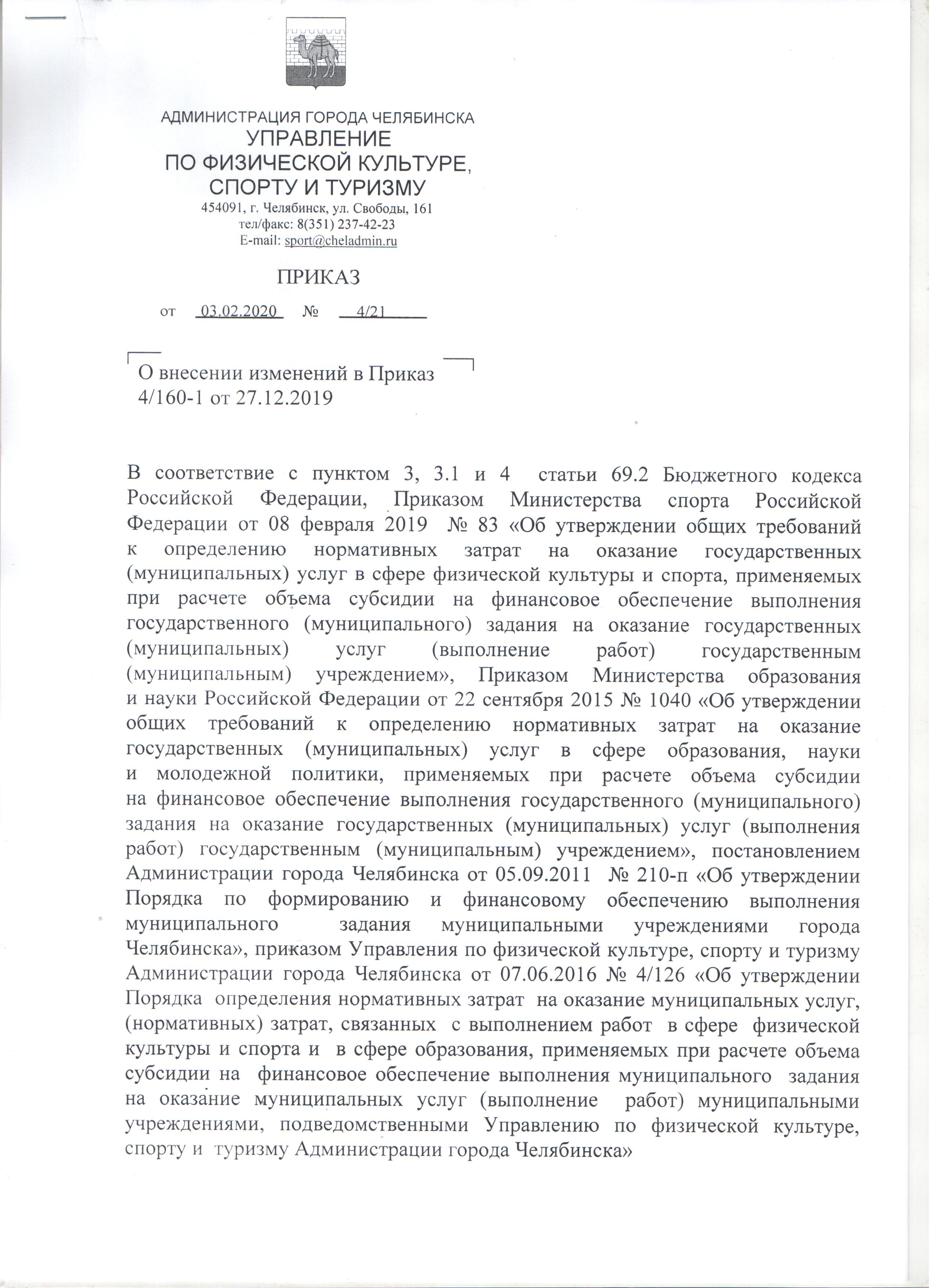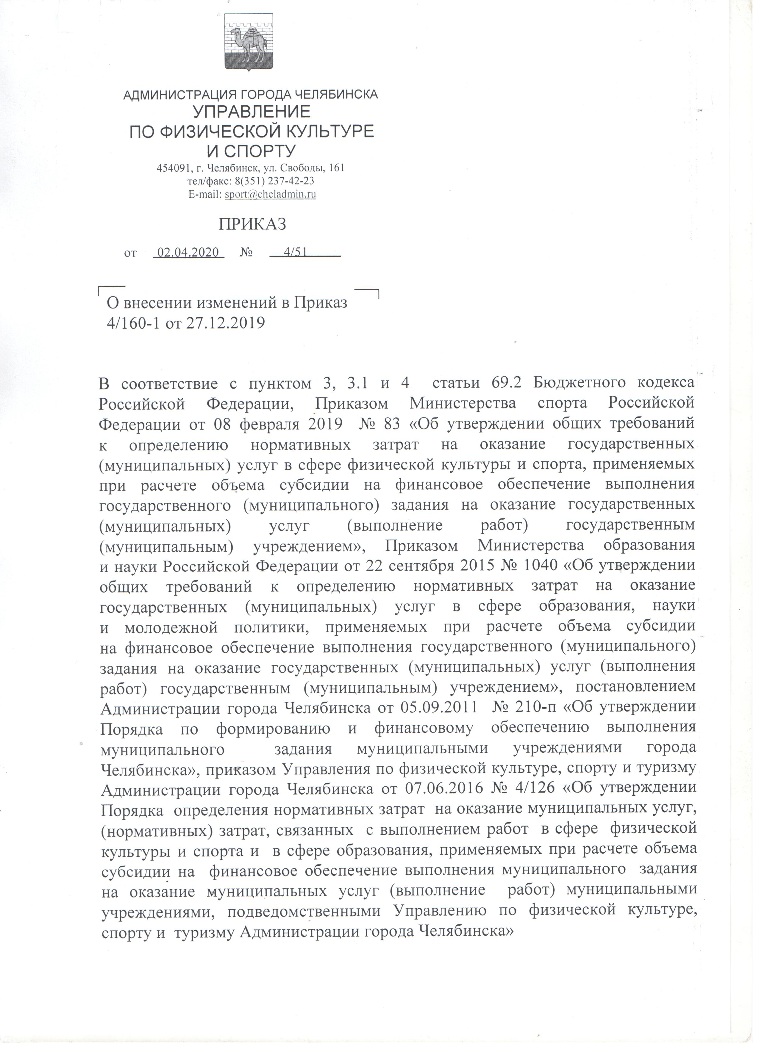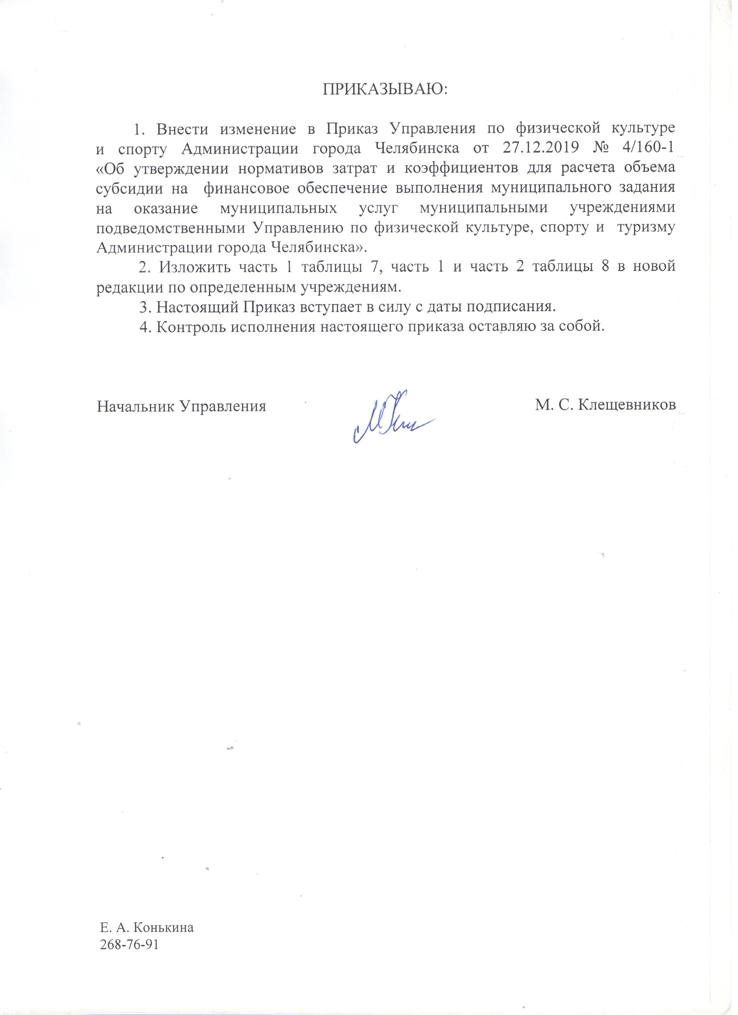 Приказ от 27.12.2019 № 4/160-1 "Об утверждении нормативов затрат и коэффициентов для расчёта объема субсидии на финансовое обеспечение выполнения муниципального задания на оказание муниципальных услуг муниципальными учреждениями, подведомственными Управлению по физической культуре, спорту и туризму Администрации города Челябинска
