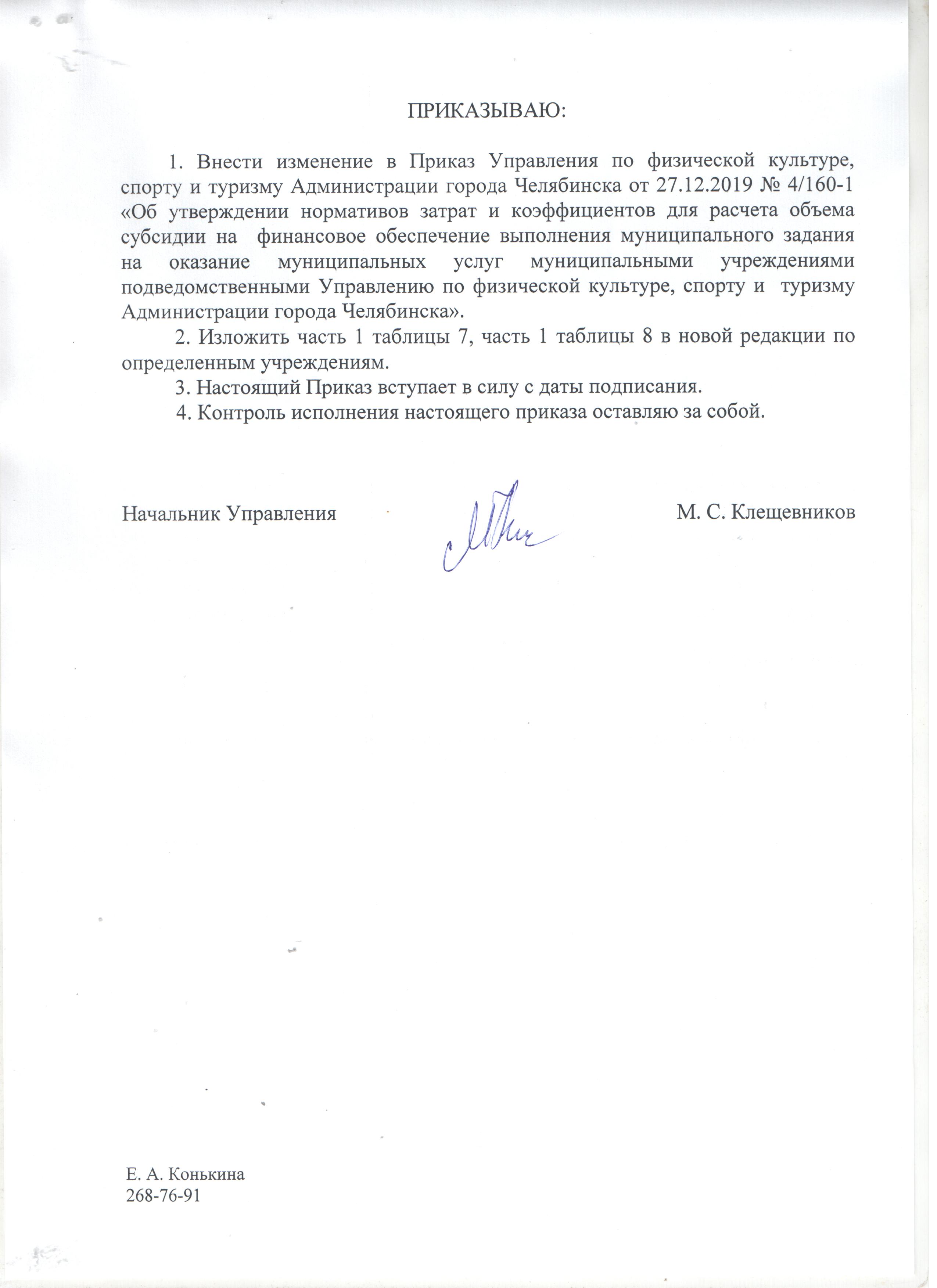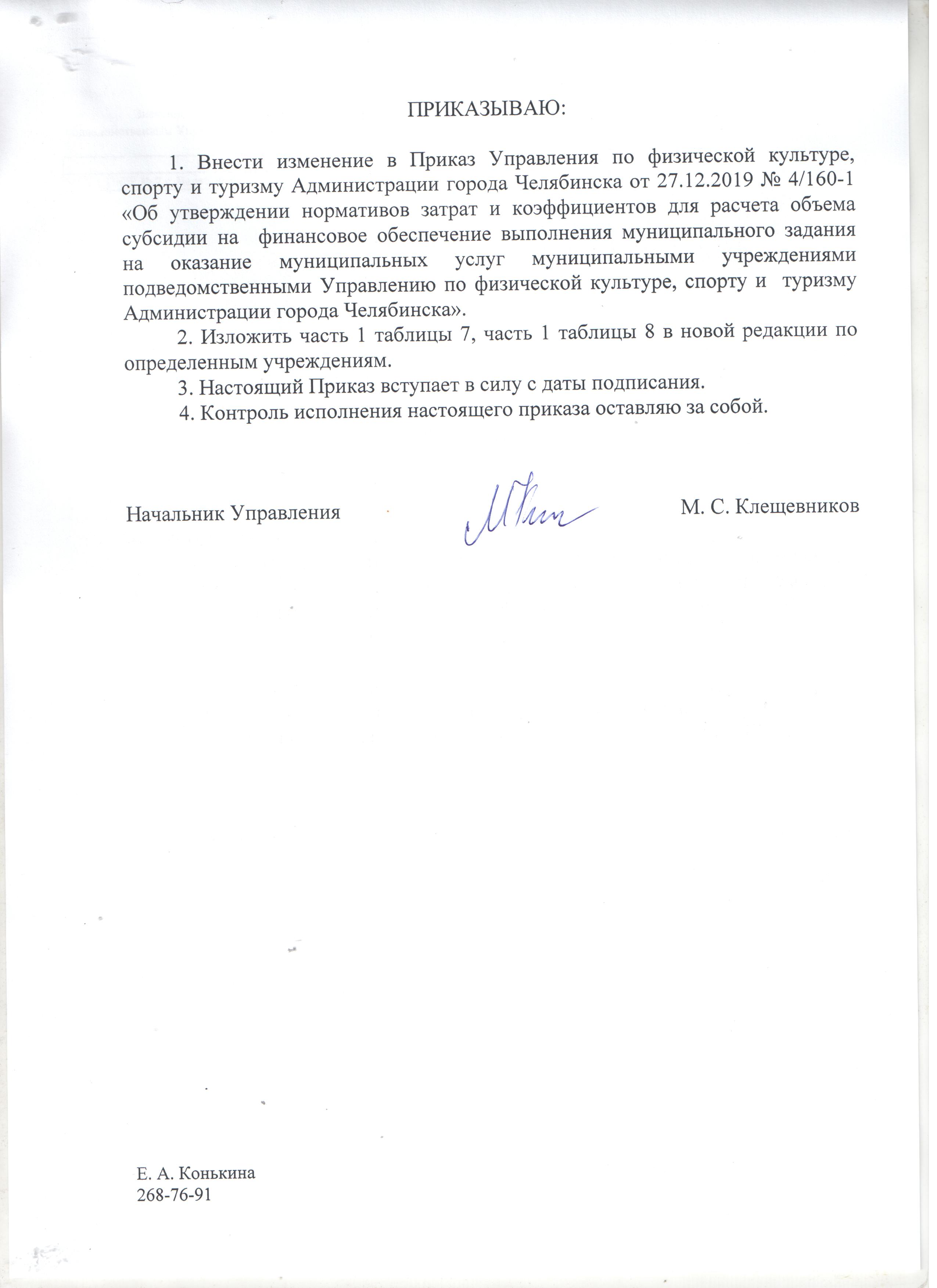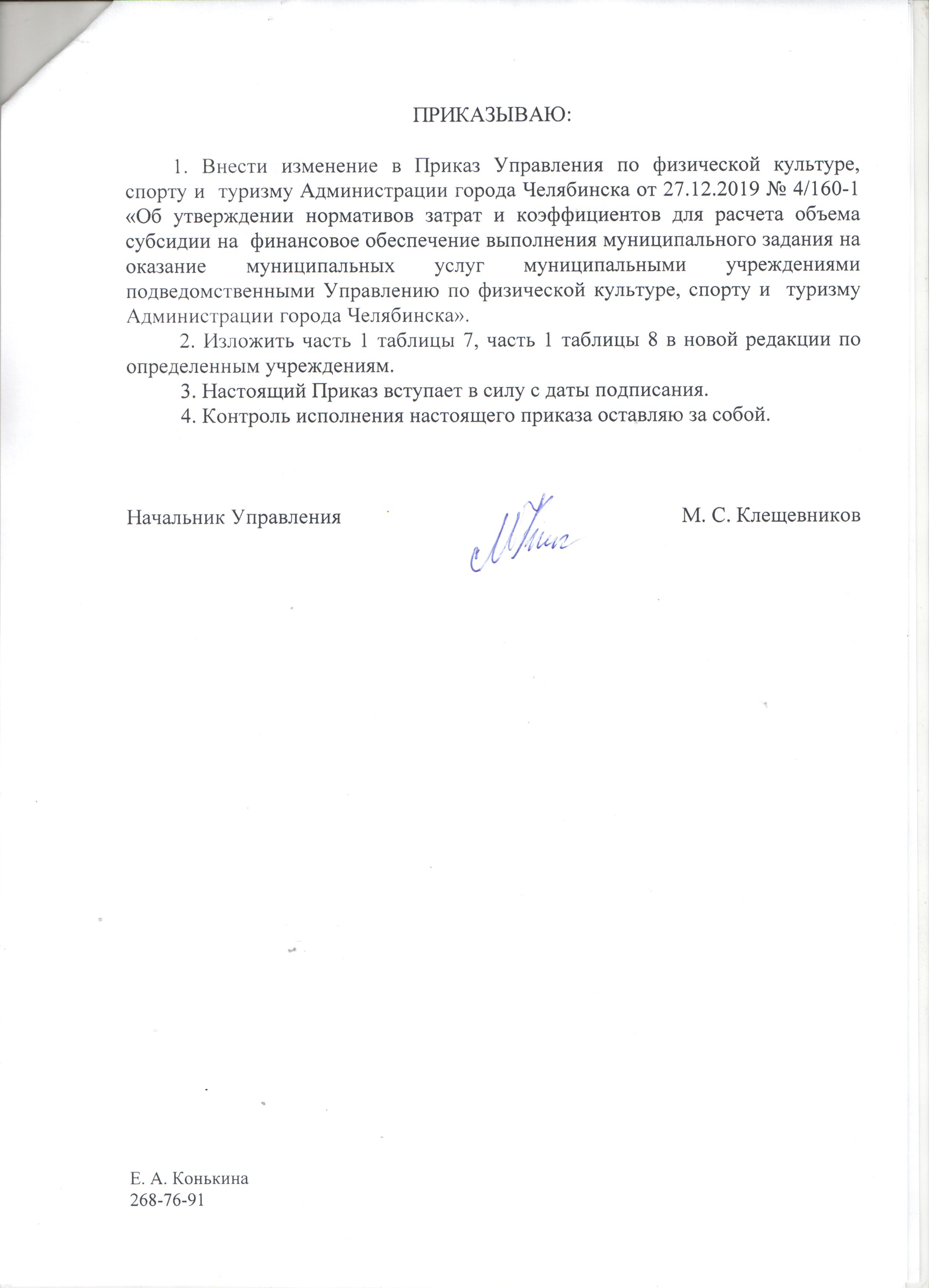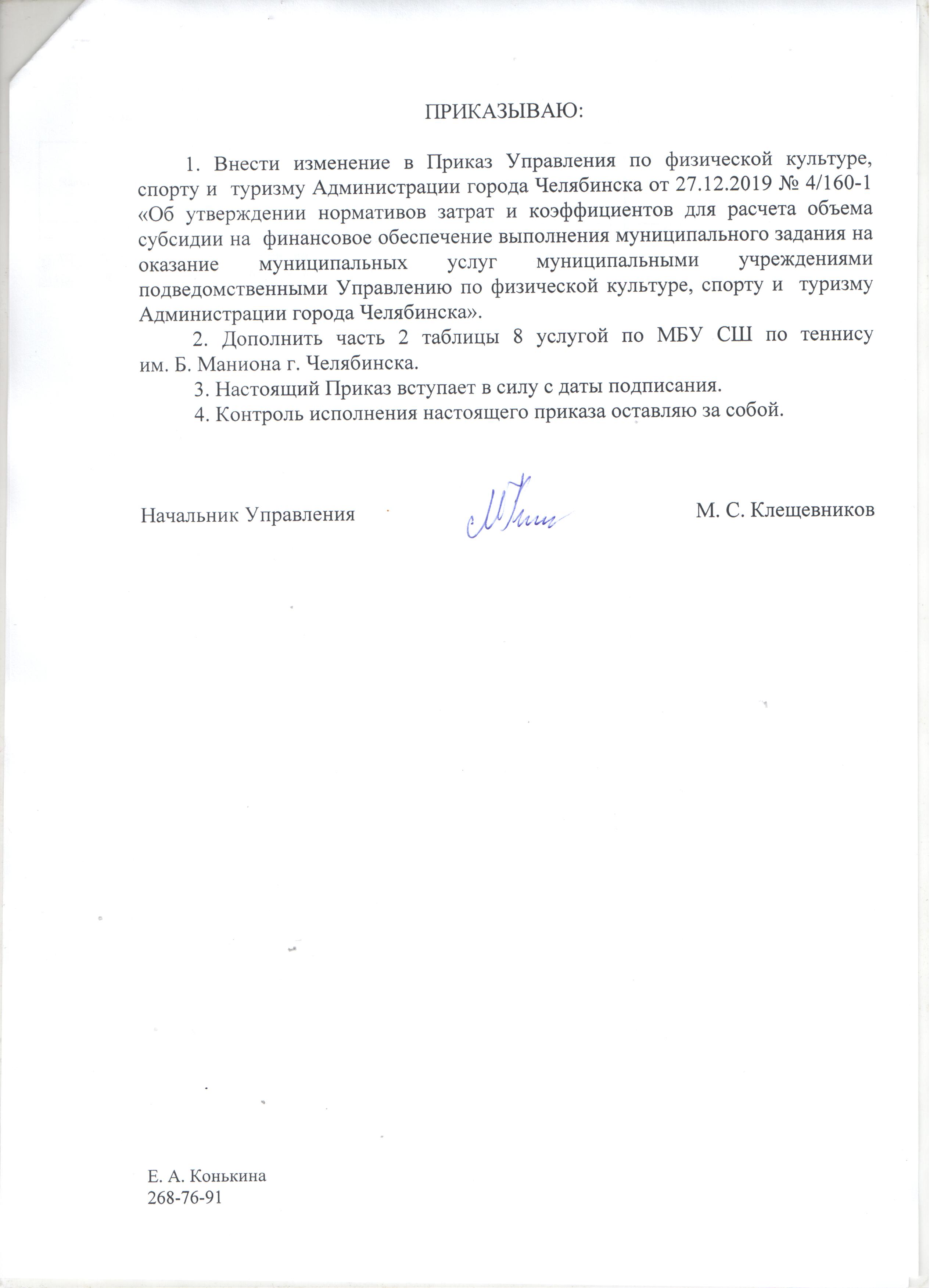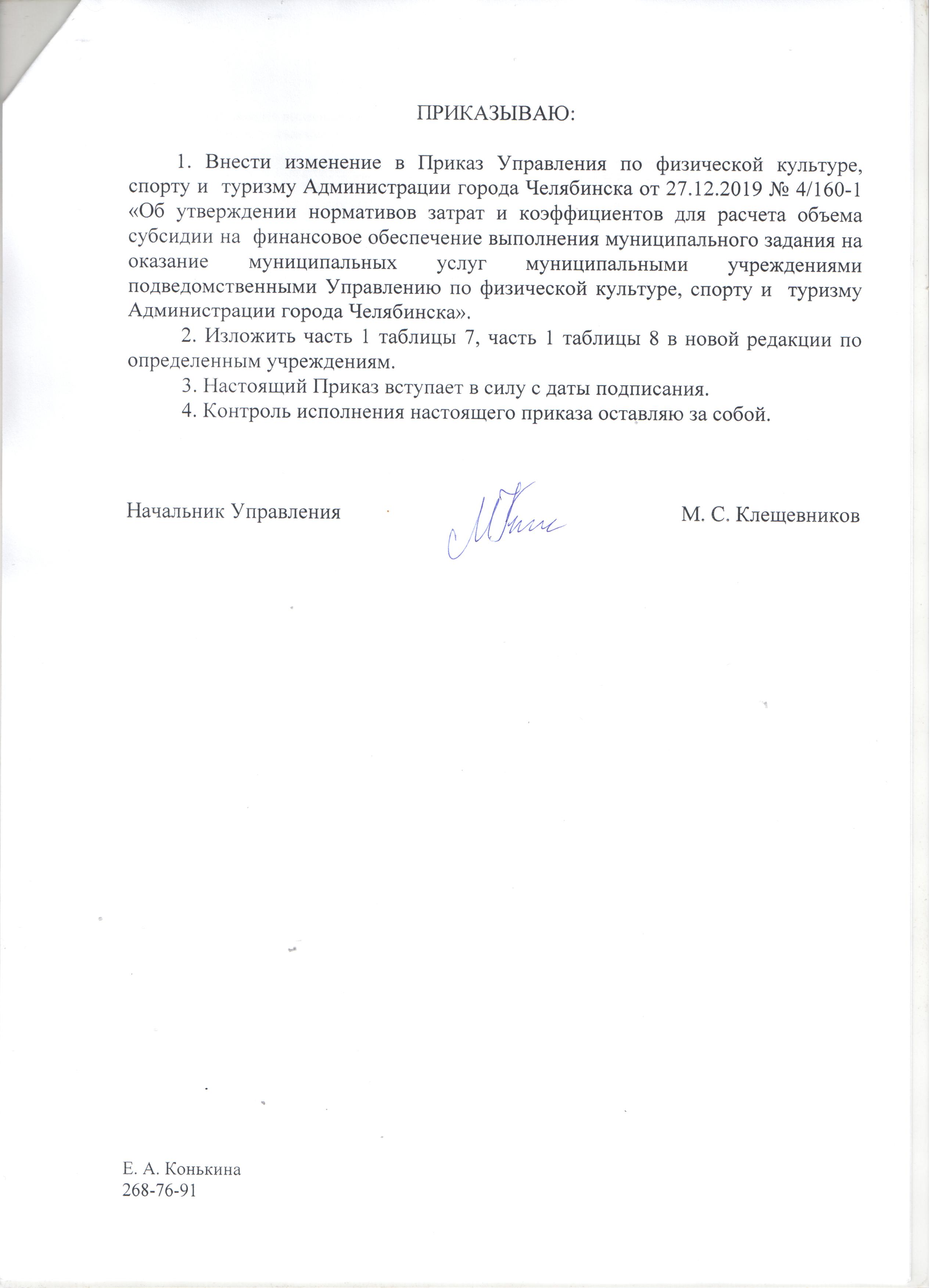 Приказ от 27.12.2019 № 4/160-1 "Об утверждении нормативов затрат и коэффициентов для расчёта объема субсидии на финансовое обеспечение выполнения муниципального задания на оказание муниципальных услуг муниципальными учреждениями, подведомственными Управлению по физической культуре, спорту и туризму Администрации города Челябинска